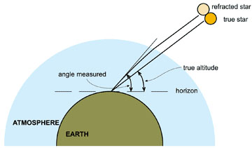 Lewis opens his book Tables Requisite to the table 'Mean Refraction' and using the altitude derived from Step C he finds that he has to subtract 24". Refraction is the bending of a light ray as it passes through the atmosphere. This bending results from the increase in the atmosphere's density as the light ray travels downward toward the observer. Refraction makes an object appear higher in the sky than it actually is. The light ray always appears to be bent upwards except when it is vertical, therefore, Lewis subtracted 24" from the apparent altitude found in Step C.