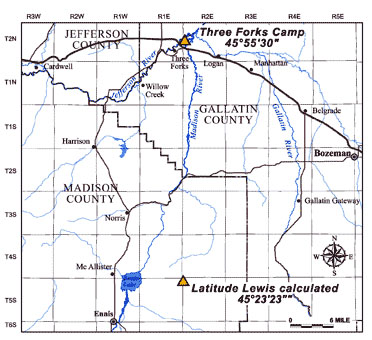 H) From co-latitude to latitude. Steps A through G produce what is called a 'co-latitude'. A co-latitude is the angle which when added to the latitude equals 90° that is 90° - co-latitude = latitude. To derive the calculated latitude from this observation Lewis subtracts the co-latitude from 90°. 90°00'00"- 44°08'00" 45°52'00" LATITUDE 45°52' Latitude to nearest arc minute per this observation (about 3 miles too far south) 45°55°' Latitude of camp determined from map analysis 45°23'23" Lewis's calculated latitude using incorrect index error of 2°40' instead of 2°11'40"